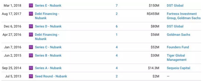 Nubank的主营业务是虚拟信用卡,于2013年成立于巴西。在腾讯注资之前,已经先后获得了5轮融资。今年年初,Nubank获得由DST Gobal领投的1.5亿美元E轮融资,晋级为独角兽。