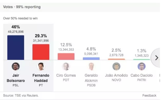 10月7日的第一轮大选中, 博尔索纳罗获得了将近半数的选票,然而因为直接超过半数而没能直接当选。 几周后的第二轮博尔索纳罗和劳工党的哈达特谁会胜出还真说不好。