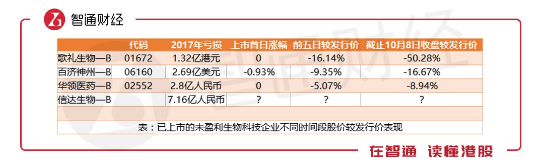 不过能明显看到的是,在歌礼生物—B“以身试法”之后,百济神州—B(06160)、华领医药—B(02552)的表现无疑要好很多。那么,在市场对未盈利生物科技企业逐渐熟悉之后,信达生物能否逃离破发“魔咒”?