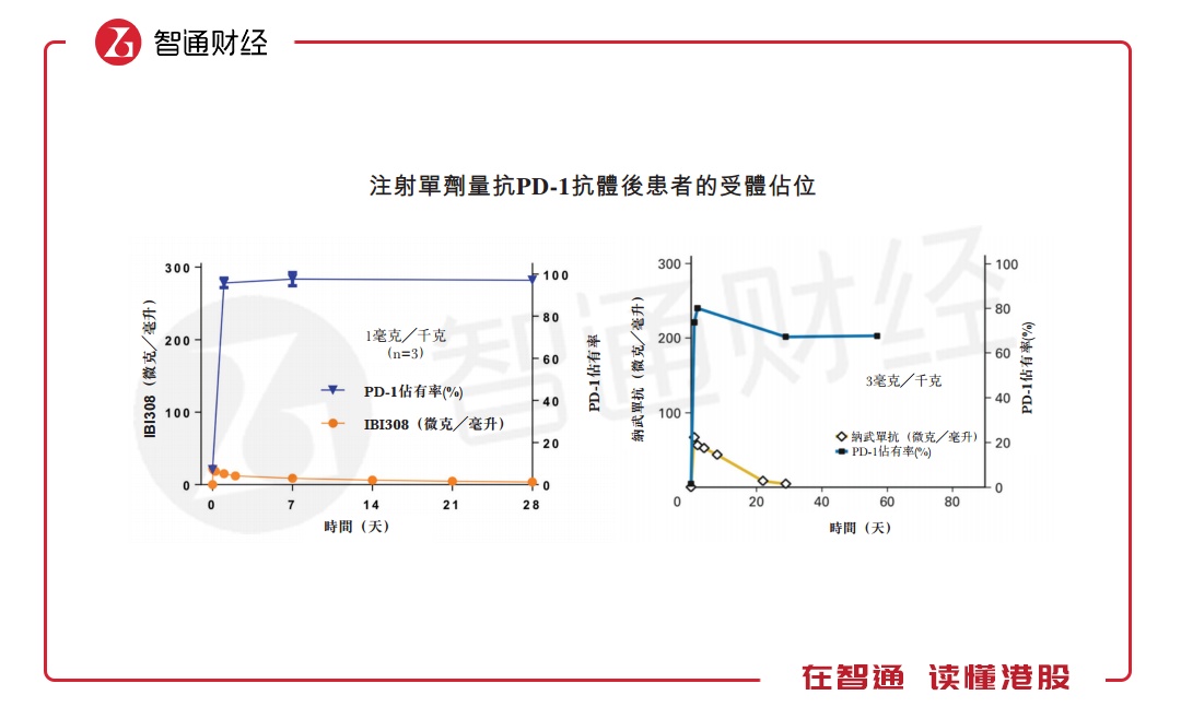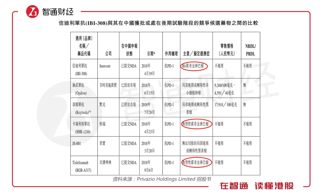 信达生物的信迪利单抗IBI-308便是PD-1抗体药物,据招股书显示,公司的该药物有望成为同类中最佳的创新性PD-1单克隆抗体。在对中国96例经典霍奇金淋巴患者进行治疗的注册临床试验中,信迪利单抗IBI-308显示出了79.2%(第24周数据)的总体缓解率(ORR)和17.7%(第15周数据)的完全缓解率(CR),其安全性及毒性特征可与现已获批准的PD-1抗体相媲美。