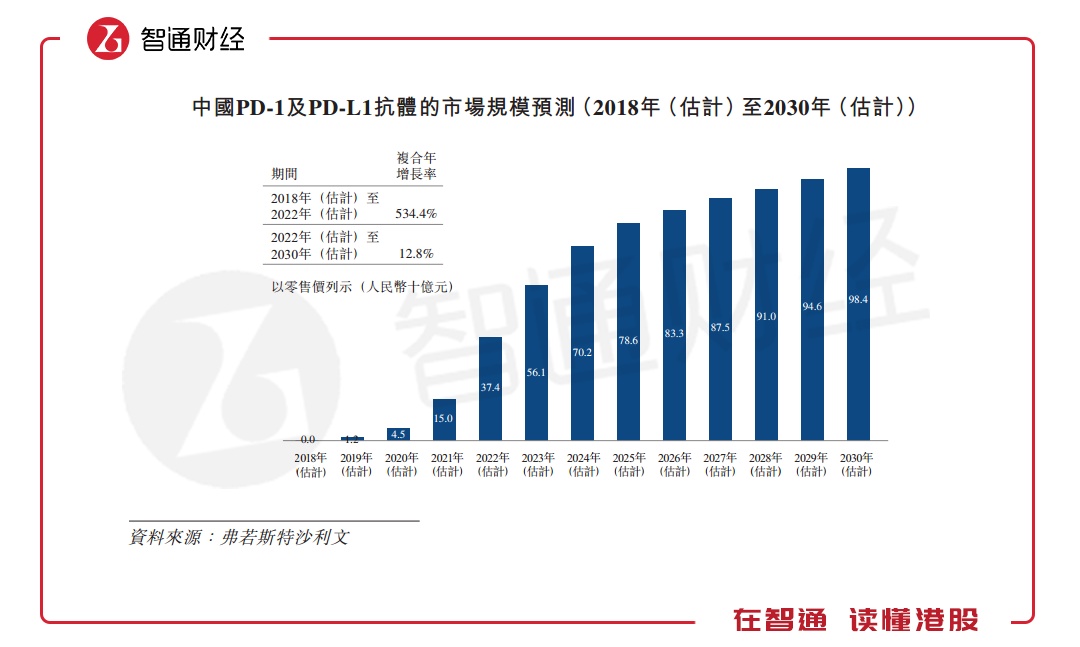 在国内几百万患者的需求下,中国PD-1及PD-L1抗体药物将迎来爆发式的增长。据弗若斯特沙利文报告显示,中国PD-1及PD-L1抗体的市场规模将从2018年的0收入增至2022年的374亿人民币,年复合增长率高达534.4%。从2022至2030年,该市场仍将保持超过10%的增长速度。
