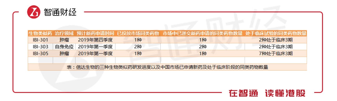 而三种生物类似药正在进行3期临床试验,分别是治疗肿瘤的IBI-301、IBI-305,以及治疗自身免疫疾病的IBI-303,三种药物预计在2019年提交新药申请。