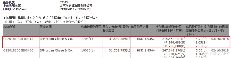 摩根大通减持太平洋航运(02343)3189万股,每股作价1.94港元