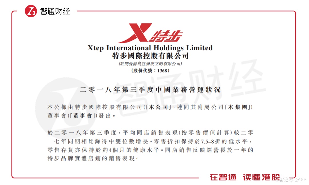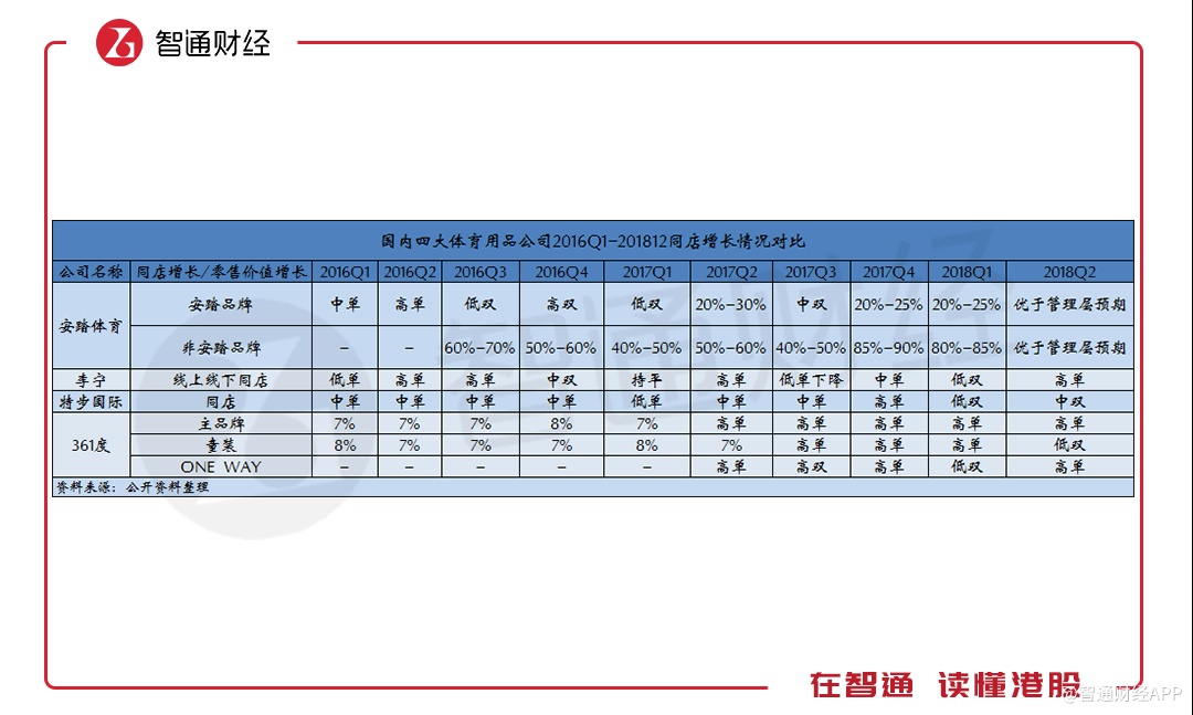 智通财经APP根据公开资料整理发现,特步过往季度的同店销售增长水平时常保持在中单位数甚至低单位数的增长水平,直到2018年一季度才实现低双位数增长,这也是公司自2013年一季度开始披露这一数据以来,首次达到双位数增长。