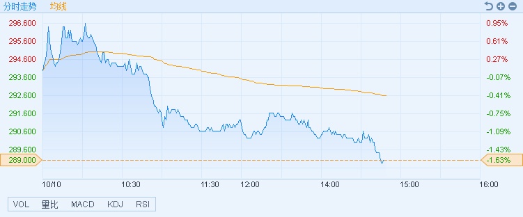 智通财经APP获悉,腾讯(00700)午后股价跌破290港元关口,续创15个月新低,拖累恒指40点。该股连续第九日下跌,为上市以来最长连跌。截至14时48分,跌1.63%,报价289港元,成交额64.6亿。