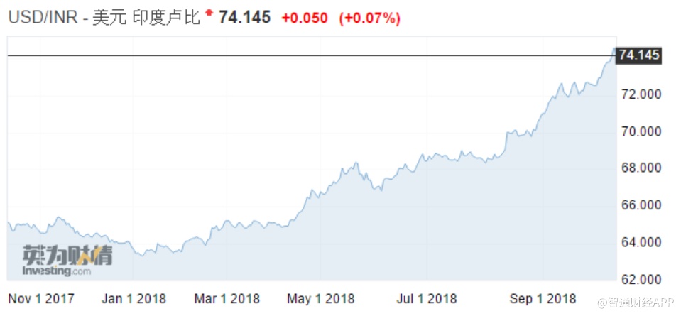 此前印度卢比陷入危机,而到了10月,这种局面仍未改变。10月1日起,一波跳水又将卢比推入新的历史低位,现报74.145,仍在持续下跌。
