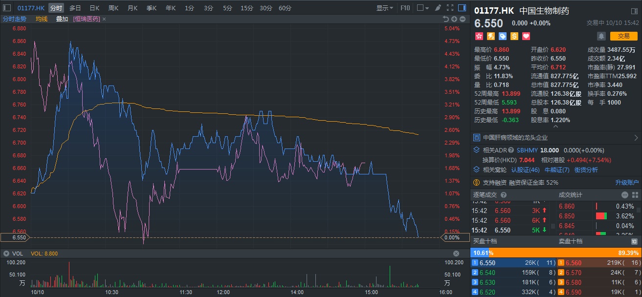 这对我国肿瘤患者的确是天大的喜讯,可谓“功在当代,利在千秋”啊。可就药企而言,政策面前必定只能选一样:“要么以价换量,要么出局保价。”所以,落到股价方面,依旧处于观望状态:拿已入围的A股“研发一哥”恒瑞医药和港股“领头羊”中国生物制药(01177)为例,前者跌掉1.07%;后者冲高回落至0.31%。