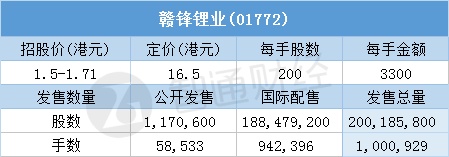 智通财经APP获悉,10月10日,中国最大的锂化合物生产商及全球最大的金属锂生产商赣锋锂业(01772)配售结束。配售招股价区间为1.5-1.71港元,最终定价16.5港元,每手3300港元。