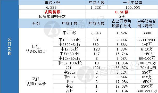 其中,公开配售申购人数4228,一手中签率100%,认购倍数0.58倍。