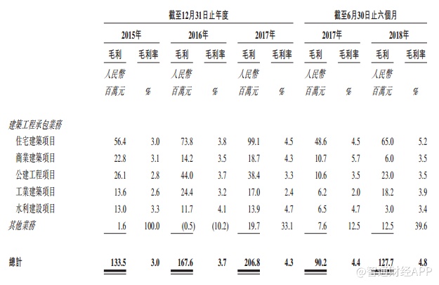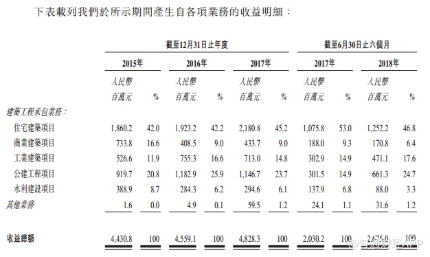 鸿翔建设的主营业务是建筑工程承包业务,其中住宅建筑项目占比最大,且毛利率高于其他建筑项目。今年上半年,来自住宅建筑项目的工程承包业务收入为12.52亿元,占总收入46.8%。从历年数据看,在2015-2017年三年期内,鸿翔建设的住宅建筑项目收入占比逐年增加,在房地产投资火爆的日子里,鸿翔建设享受了一段美好时光。