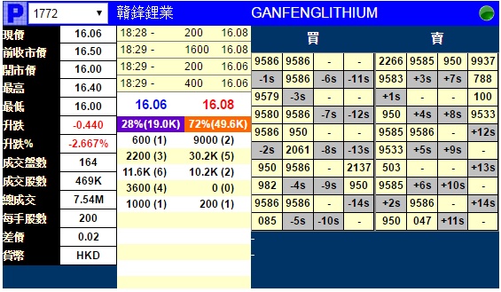 新股暗盘 |赣锋锂业(01772)收报16.06元 每手亏88元