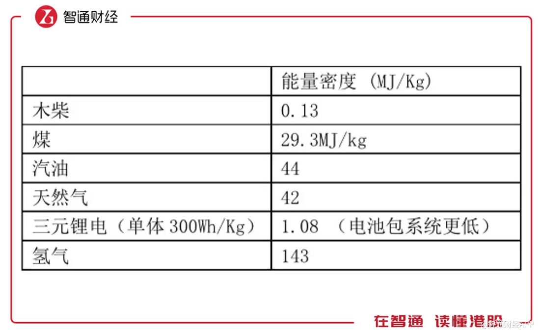 经智通财经APP对比,发现氢燃料电池转移一个电子比铅酸电池和锂电池需要的质量更小,简单地说,就是能量密度更大。从下表也可以看出,氢能的能量密度占据绝对优势。