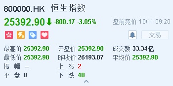 智通财经APP获悉,美股周三低开低走,盘中持续下挫,临近尾盘出现恐慌性抛售,道指暴跌逾800点。恒生指数开盘跌3.05%或800.17点,报25392.9点。国企指数跌2.94%,报10135.47点。红筹指数跌2.52%,报4160.34点。大市盘前成交33.34亿港元。
