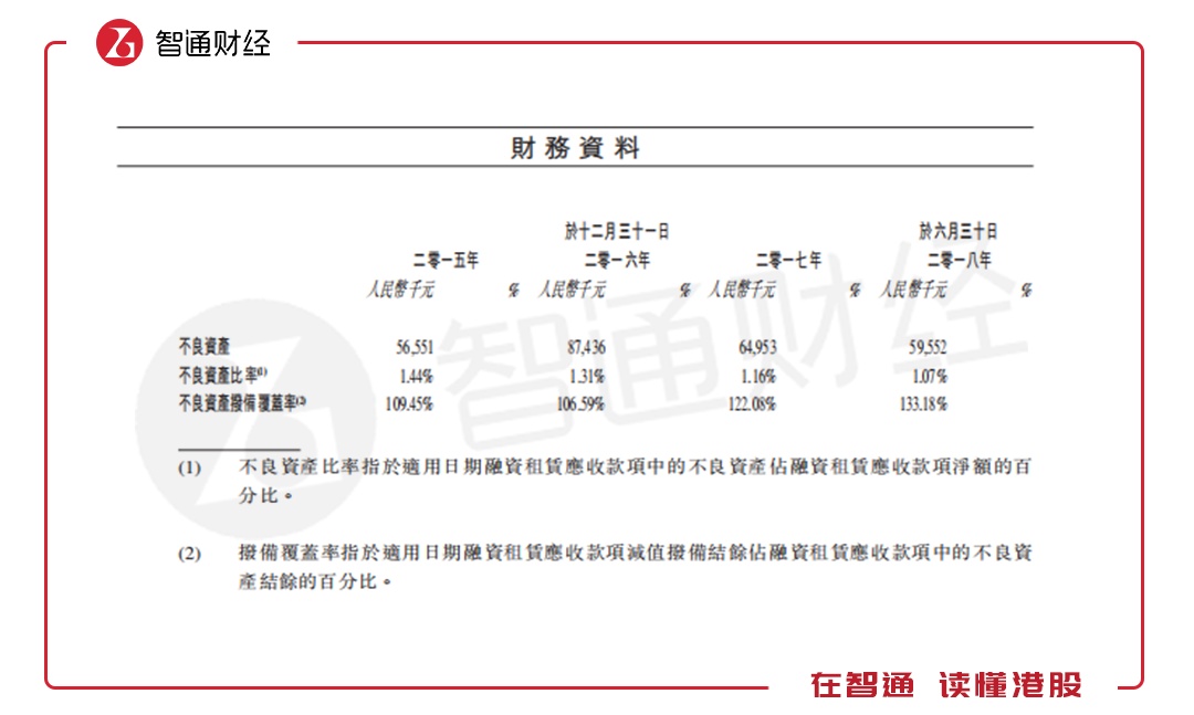 其次,道生于2015年、2016年及2017年12月31日以及2018年6月30日,融资租赁应收款项中的不良资产分别为5660万元、8740万元、6500万元及5960百万元。上述日期公司融资租赁应收款项中的不良资产比率分别为1.44%、1.31%、1.16%及1.07%保持下降趋势。而于上述日期公司融资租赁应收款项的拨备覆盖比率分别为109.45%、106.59%、122.08% 及133.18%,稳步提升。