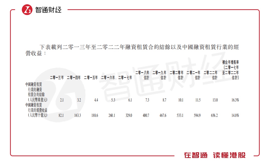 根据弗若斯特沙利文的资料,2017年中国融资租赁行业的经营收益3.29万亿元人民币(单位下同),预计2022年这一数字将达到6.56万亿元,2017年至2022年复合年增长率为14.8%。