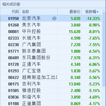 智通财经APP获悉,恒指早盘低开800点,汽车股遭重创,截至11时00分,北京汽车(01958)跌14.33%,报价5.02港元,长城汽车(02333)跌7.65%,报4.59港元,广汽集团(02238)跌7.55%,报7.22港元,吉利汽车(00175)跌5.23%,报13.04港元。