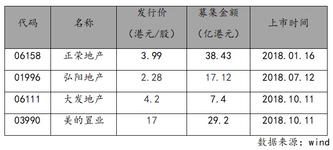 智通财经APP获悉,10月11日,大发地产(06111.HK)、美的置业(03990.HK)同时在港交所成功挂牌上市,加上此前于1月份上市的正荣地产(06158.HK),7月份上市的弘阳地产(01996,HK),2018年港股上市内地房地产企业增至四家,共计募资金额为92.15亿港元。