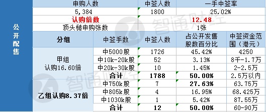 其中,公开配售申购人数5384,一手中签率25.02%,认购倍数12.48倍。
