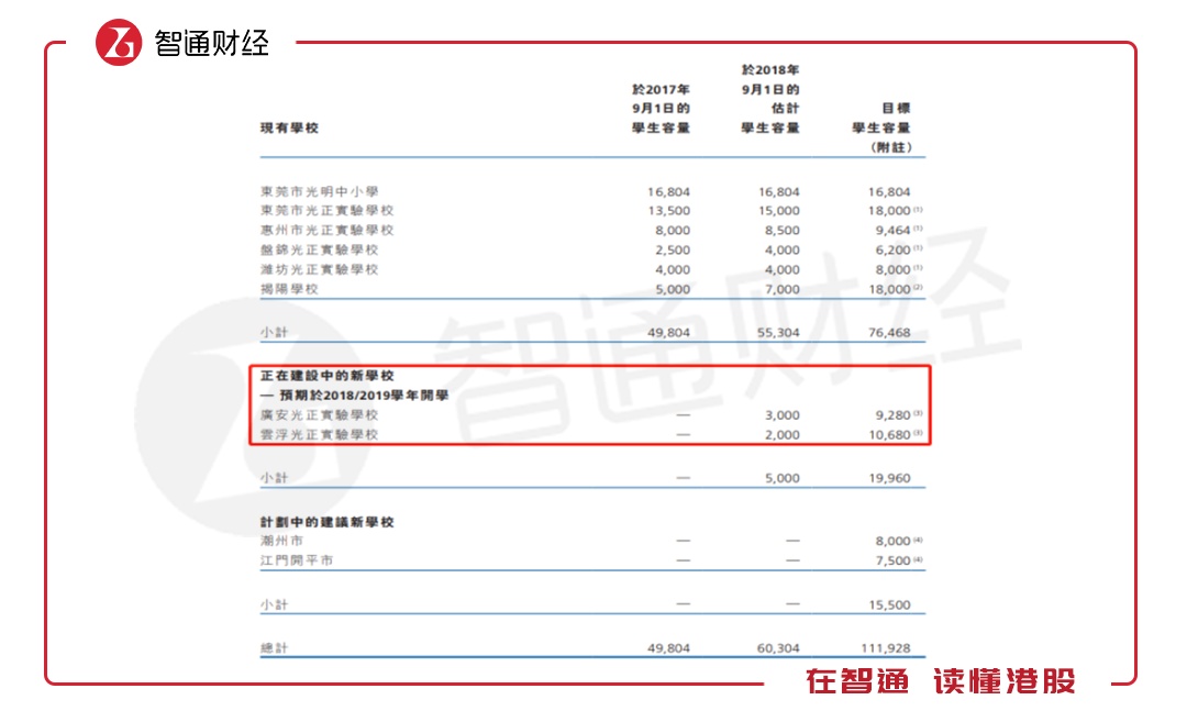 正在建设的两家广安光正和云浮光正实验学校,这两所学校分别在2016年5月和7月份和相关政府合作建校,本来预计是2017年9月份开校,但到2018年9月份仍未实现开校。2018年9月份该公司学生人数为51520人,仍低于现有学校预计的学生容量。