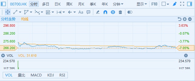 今日全球股市大震荡,腾讯也难以幸免,股价最低可达265港元,截至发稿,腾讯跌7.05%,报266.2港元,成交额达173亿港元。