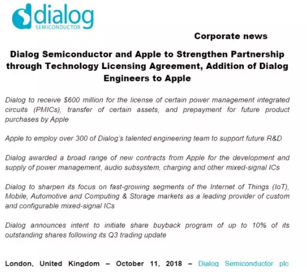 “2017年12月4日,Dialog 在一场面向投资者的电话会议中承认,苹果已经具备自主研发电源管理芯片的资源和能力,而且在未来几年内很有可能这么做。尽管当时Dialog据理力争地一再表示,至少在 2018 年,它与苹果之间的合作关系是不会发生改变的,但由于苹果自研电源关心芯片的可能性一直存在,而这种可能性对于 Dialog 就是一直存在的严重威胁。”
