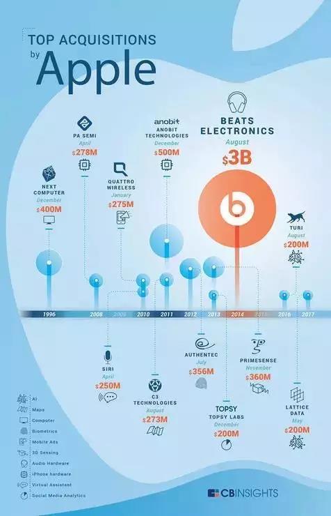 如上图所示,苹果公司在其最重要的12起并购交易中共花费了60亿美元,而其在2014年以30亿美元收购Beats Electronics。