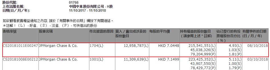 智通财经APP获悉,根据香港联交所资料显示,摩根大通于10月8日减持中国中车(01766)1296万股,每股作价7.04港元,总值约9129万港元,最新持股量降至4.93%。