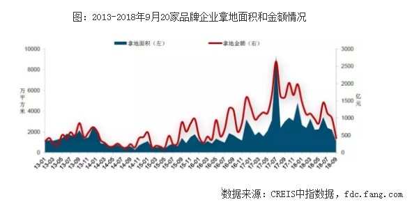 据初步统计,2018年1-9月,20家品牌房企共拿地2.2亿平方米,同比下降20.9%;累计拿地金额9534亿元,同比下降27.8%。
