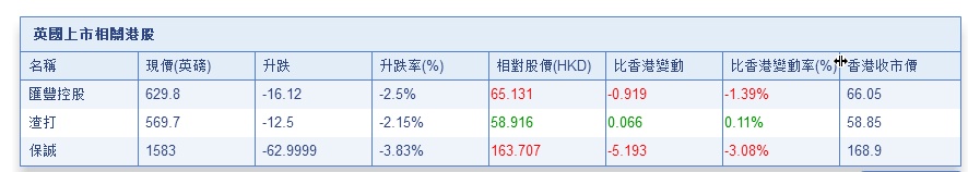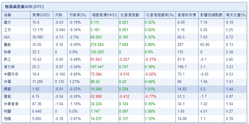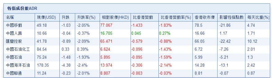 港股ADR靠稳,大型蓝筹个别发展,汇丰控股收报65.47元,较港收市跌0.58元;腾讯控股收报274.62元,较港收市升7.62元,升幅达2.85%。油股疲弱,中石油收报5.9元,较港收市跌0.09元;中海油收报13.99元,较港收市跌0.29元。。具体数据如下: