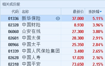 智通财经APP获悉,受益于央行降准,内险股全线上涨,截至15时00分,新华保险(01336)涨5.11%,报价37港元,中国财险(02328)涨3.96%,报8.93港元,众安在线(06060)涨3.8%,报27.3港元,中国平安(02318)涨2.15%,报73.65港元。