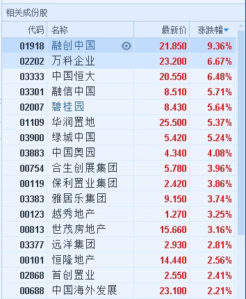 内房股集体上扬,截至15时35分,融创中国(01918)涨9.36%,报21.85%,万科企业(02202)涨6.67%,报23.2港元,中国恒大(03333)涨6.48%,报20.55港元,融信中国(03301)涨5.71%,报8.51港元,碧桂园(02007)涨5.64%,报8.43港元。