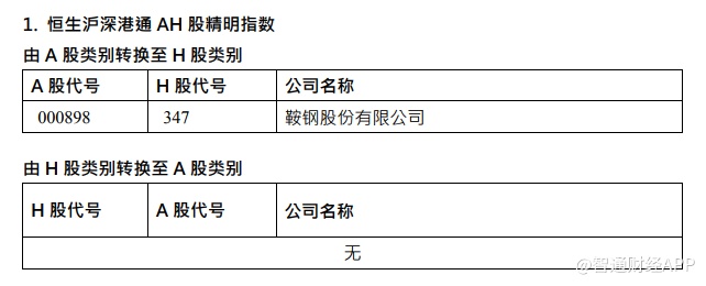 恒生沪深港通 AH 股精明指数中,鞍钢股份将由A 股类别转换至 H 股类别。