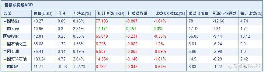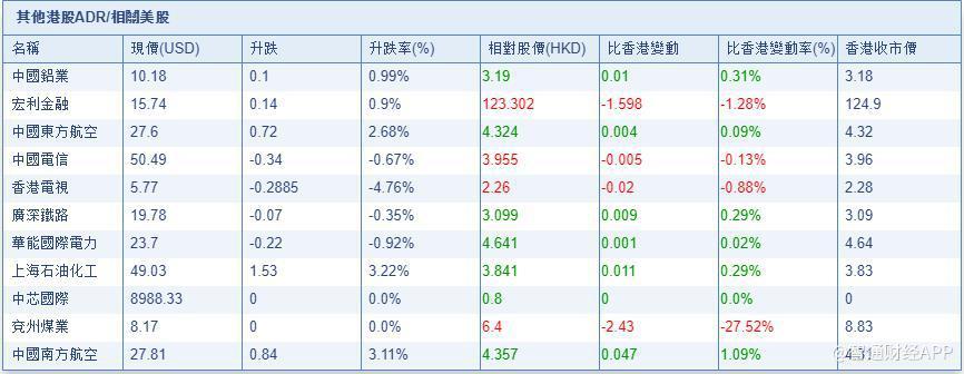 各类蓝筹股走势不一,腾讯收报296.662元,较港市收涨8.262元。油股继续疲弱,中石油收报5.907元,较港收市跌0.053元;中海油收报14.354元,较港收市跌0.146元。此外,中国移动收报77.192元,较港收市跌0.807元。