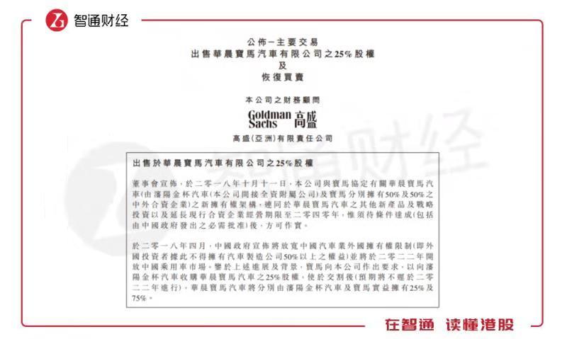 10月11日,华晨中国(01114)发布公告,证实了宝马收购的真实性,称宝马向该公司要求向渖阳金杯汽车收购华晨宝马汽车之25%股权,预期将不迟于2022年进行,可见宝马将打响了“股比限制”放开的第一枪。