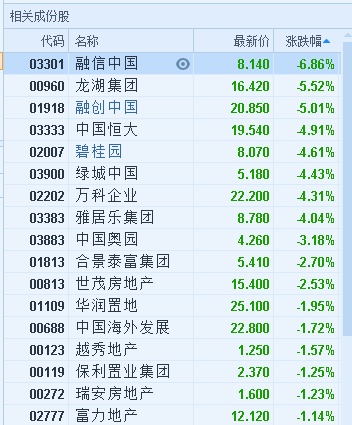 智通财经APP获悉,内房股集体下挫,截至11时46分,融信中国(03301)跌6.86%,报价8.14港元,龙湖集团(00960)跌5.52%,报16.42港元,融创中国(01918)跌5.01%,报20.85港元,中国恒大(03333)跌4.91%,报19.54港元,碧桂园(02007)跌4.61%,报8.07港元,绿城中国(03900)跌4.43%,报5.18港元,万科企业(02202)跌4.31%,报22.2港元。