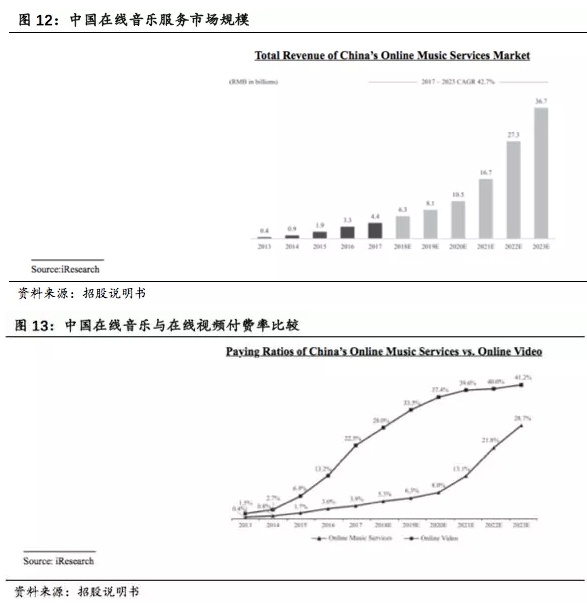 根据艾瑞咨询的数据,2017年中国在线音乐服务的整体市场规模约44亿元,预计到2023年将增长至367亿元,2017年至2023年复合年增长率为42.7%。