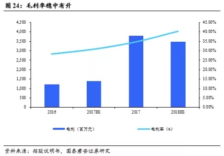 毛利率稳中有升。公司毛利从2017H1的13.82亿元增加151.7%,2018年H1实现毛利34.78亿元;毛利率从2017H1的30.81%提升到2018H1的40.35%。