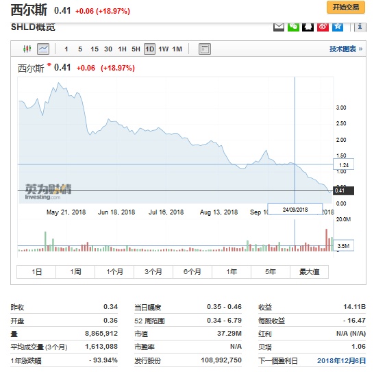 Sears自2011年以来累计亏损逾110亿美元,年销售额下降近60%,至167亿美元。该公司每年需要筹集超过10亿美元的资金才能维持运营。其股价曾在2007年达到每股超过130美元,而如今却跌至不足1美元。今天开盘后,Sears一度开盘下跌38%。