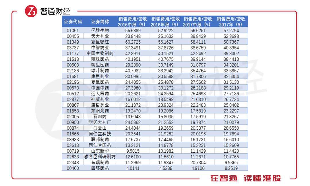 事实上,和A股疫苗公司一样,港股虽无真正做疫苗的企业,但也冒出不少销售费用偏高的药企。智通财经APP根据2017年财务数据对比发现,港股医药板块销售费用占总营收比例最高分别为亿胜生物(01061)、天大药业(00455)、复旦张江(01349)。