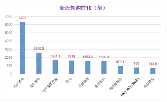 2017年新股平均超购137倍,而今年前三季度新股公开发售部分平均认购194倍,是因为参与新股的投资者变多了。其中12只新股认购不足,主要集中在金融、地产等大盘股。认购超千倍的新股一共6只,3月28日上市的毛记葵涌(01716)超购6289倍,成为历年新股超购王,今年超购排名第二的是开奶茶店的宾仕国际(01705),超购2600倍。