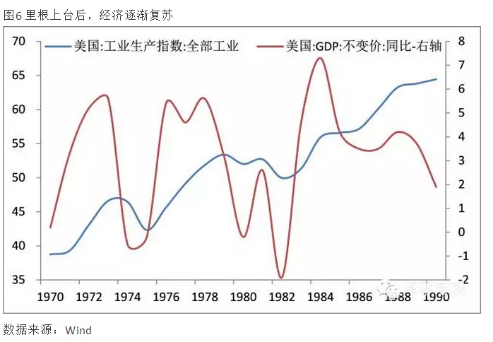后期经济复苏增长。从1982年末开始,美国经济开始复苏。1983年GDP增速达到4.6%,一直到里根任期结束GDP增长率维持在3.5%以上;失业率也从1983年7月开始逐渐降低,至1989年末一直维持在6%以下;工业生产指数于1983年2月开始稳定上升,至1989年12月达到68.3,比1983年初增长29.8%。