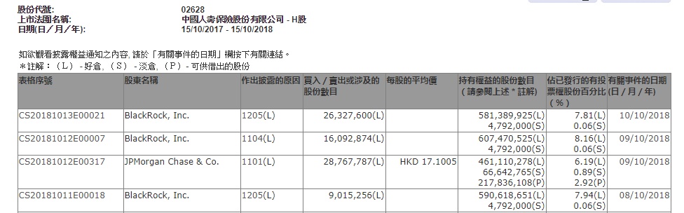 智通财经APP获悉,根据香港联交所资料显示,摩根大通于10月9日减持中国人寿(02628)2876万股,每股作价17.1港元,总值约4.9亿港元,最新持股数目约4.61亿股。