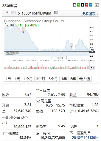 截至今日收盘,广汽集团(02238)报7.09港元,跌2.48%。