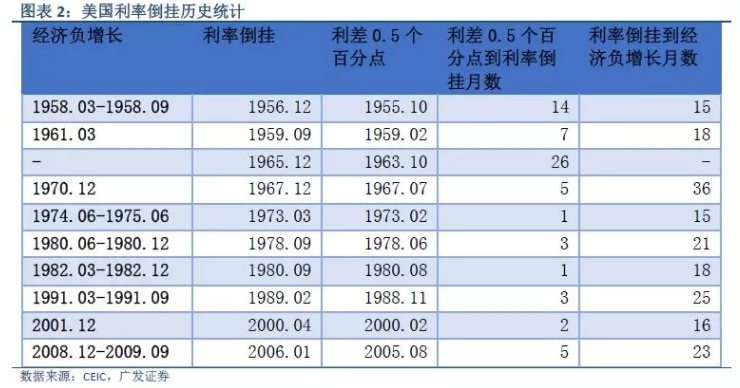 历史数据显示,利率倒挂领先于经济衰退和股市调整。自1950年以来,总共发生10次利率倒挂,最终有9次导致经济衰退(即出现负增长),另外一场发生在1960年代中期,利率倒挂后经济增速放缓(图表1)。