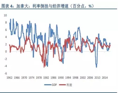 不仅在美国,利率倒挂在英国、德国、澳大利亚和加拿大都具有良好的预测能力。图表3显示,英国经济衰退前都会发生利率倒挂,加拿大也不例外(图表4)。