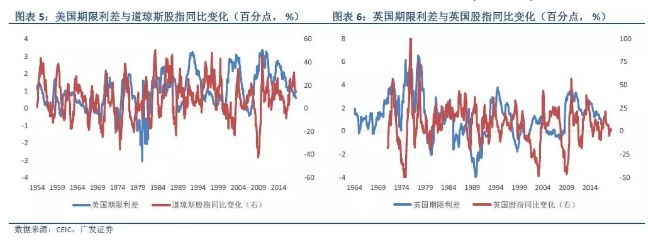 同样地,当期限利差接近零或为负时,通常会触发股市大幅度调整。1950 年以来美国出现的10 次利率倒挂中,无一例外都出现了道琼斯指数的大幅下调,平均最大下跌幅度为同比21.2%(图表5)。大多数情况下,期限利差触底领先于股指调整底,在这10 次中共出现了8 次,只有2 次股市调整早于期限利差底。英国的情况也比较类似,从1970 年以来共发生过6 次期限利差倒挂,随后都出现了股指的大幅调整(图表6)。