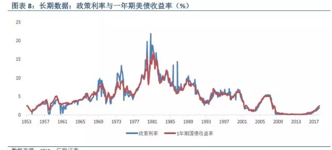 从历史上来看,短期国债收益率与政策利率高度相关,美联储加息是短期国债利率上升的主要原因。刚刚公布的9 月加息结果是美联储今年第3 次加息,也是2015 年12 月开启本轮货币政策紧缩周期以来的第8 次,这一系列的加息,成功地抬升了一年期国债收益率水平(图表8)。