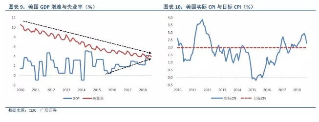 未来三个季度,美国经济仍将保持较快增长。从劳动力市场来看,自全球金融危机之后,美国失业率一路下行,今年五月份更是追平了1958 年以来的最低值3.8%(图表9)。在非农就业数据上,美国已实现2010 年以来连续96 个月正增长,创1930 列入统计以来的最长记录。劳动力市场的优秀表现带动了消费增长,同时叠加特朗普的减税措施,今年二季度美国GDP 增长4.2%,为2015 年以来最快增速。在9 月份的加息会议上,美联储也修正了自己6 月份的预测,将2018 年全年真实GDP 增速预估值由2.8%提高至3.1%。同时,美联储不惧高基数影响,将2019 年增速预估值由2.4%微调至2.5%。虽然中美贸易摩擦可能对美国经济带来一定的负面影响,但总体而言,美国良好的经济增长势头应该会持续到明年上半年。
