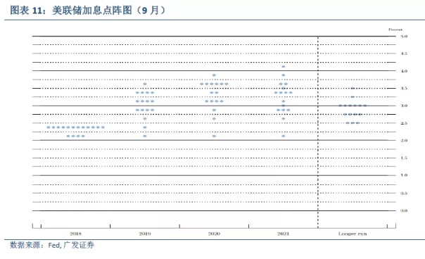 良好的经济基本面和上升的通胀压力将会促使美联储继续加息的步伐。根据美联储9月公布的点阵图来看,今年12月再加25个基点的概率不低,2019年很可能会再加息3次(图表11)。如果落地,势必会推升短端利率,利率倒挂的可能性上升。