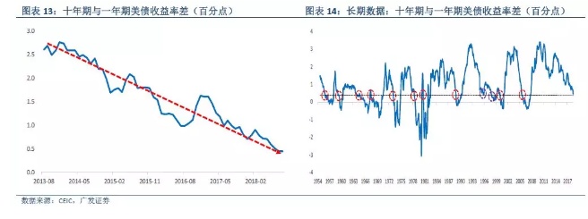 从历史经验上来看,利差收窄到目前水平之后,发生利率倒挂的可能性很大。自1954 年以来,月度利差收窄至0.5 个百分点的情况大致出现过12 次,其中有10 次最终导致了利率倒挂,2 次以阶段性回升作为结束(图表14)。